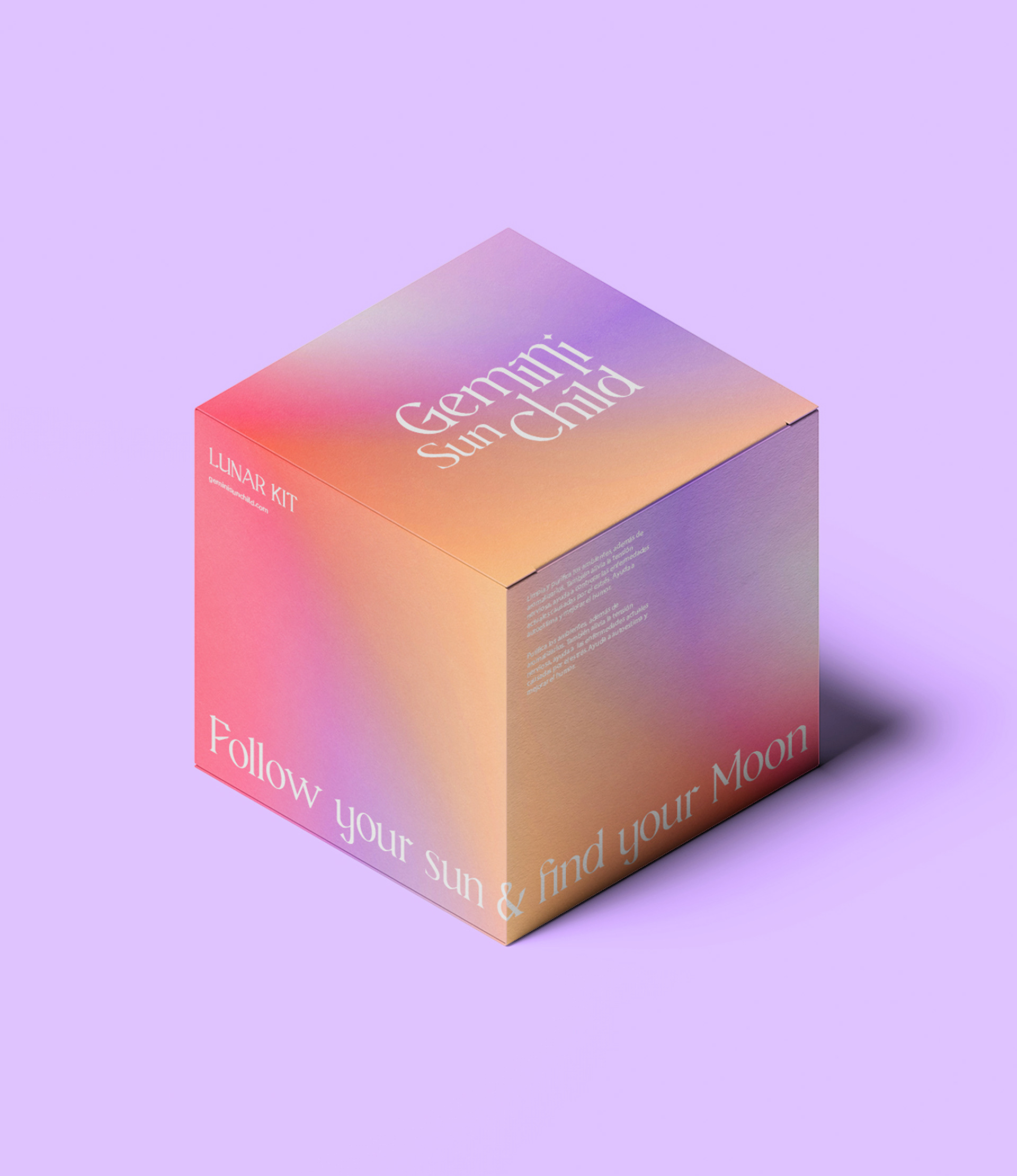 Graphic identity design for the Gemini Sun Child brand. Concept: The Sunset energy. The power of the sunset through gradients to highlight the fluidity and change of energy.